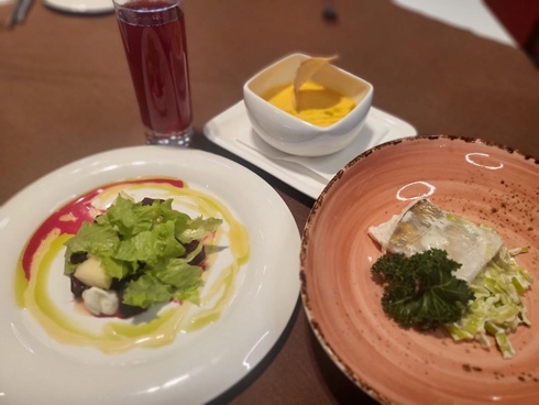 890 руб. Салат с печеной свеклой и медовым яблоком Тыквенный крем-суп Филе судака, томленое в сливках с луком порей Морс брусничный